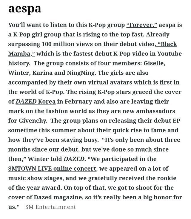2021 digital single forever 2020 single black mamba. Please make sure you visit our wiki to familiarize yourself with the rules before posting and. They debuted on november 17, 2020 with the digital. The group consists of karina, giselle, winter and ningning. The aespa members are karina, giselle, winter and ningning.